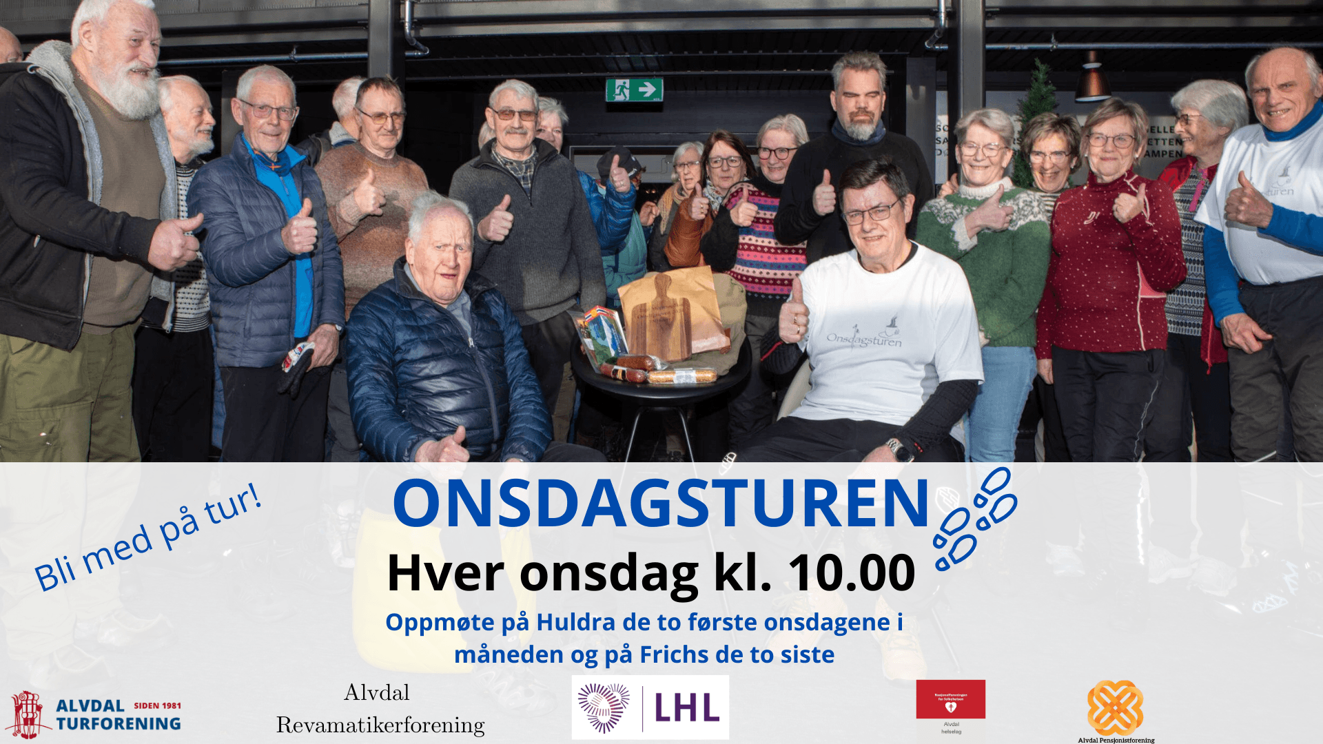 Bli med oss på onsdagsturen, hver onsdag gjennom hele året! De to første onsdagene i måneden møtes vi på Huldra, og de to siste på Frichs Taverna. Turene går stort sett i nærområdet, men av og til (særlig i sommerhalvåret) drar vi på lengre lokale turer. Vi organiserer samkjøring ved behov.