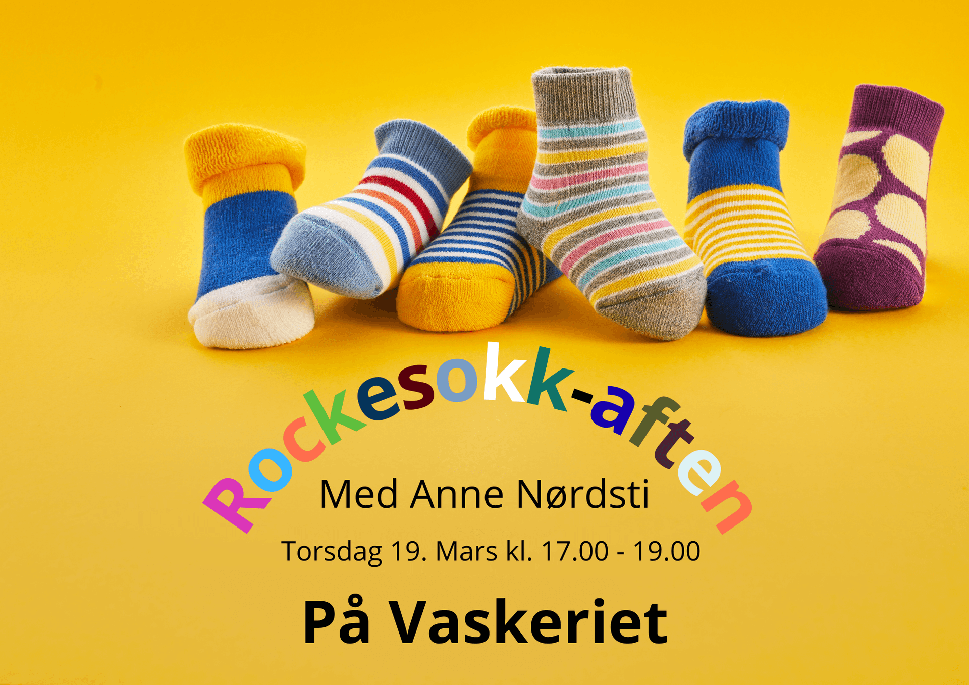 Torsdag 19. mars kl. 17.00–19.00 inviterer Vaskeriet til Rockesokk‑aften sammen med Anne Nørdsti Ta på deg ulike og fargerike sokker og bli med på en hyggelig kveld der vi feirer mangfold, inkludering og fellesskap.