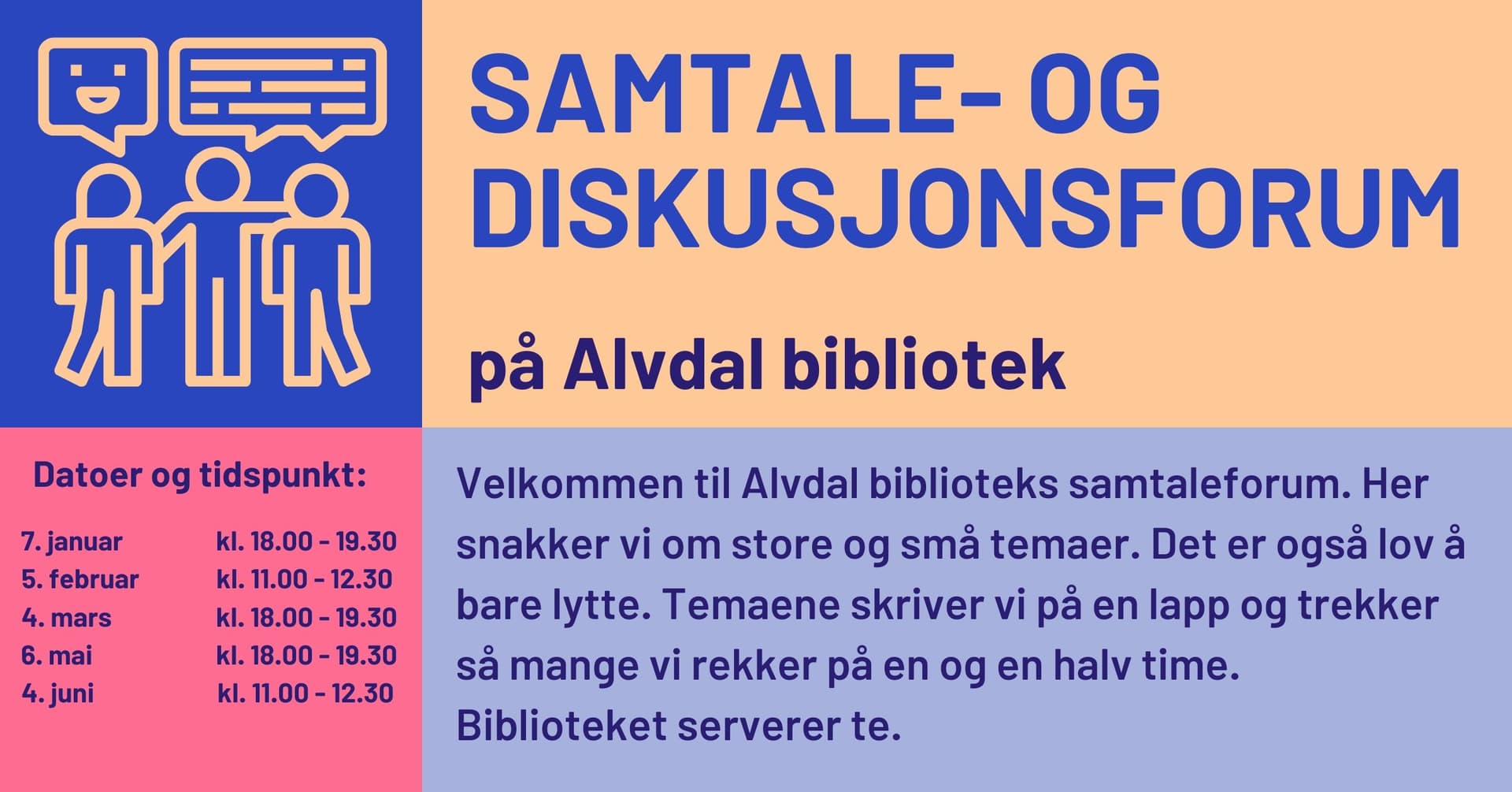 Velkommen til Alvdal biblioteks samtaleforum. Her snakker vi om store og små temaer. Det er også lov å bare lytte. Temaene skriver vi på en lapp og trekker så mange vi rekker på en og en halv time.